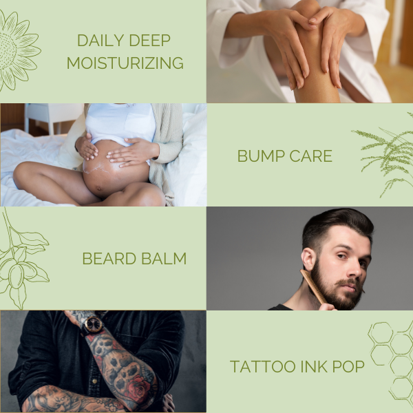You love that its made from natural, non-toxic ingredients. No more irritation, itchies or ashiness. Your skin feels calm, moisturized, smooth and protected all day long. And it makes your tattoo ink pop!