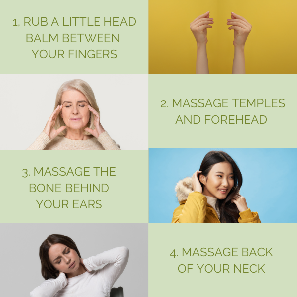 Rub a little balm between your fingers and warm it up. Then, in a symmetrical fashion, massage it into both your temples and across the top of your forehead.