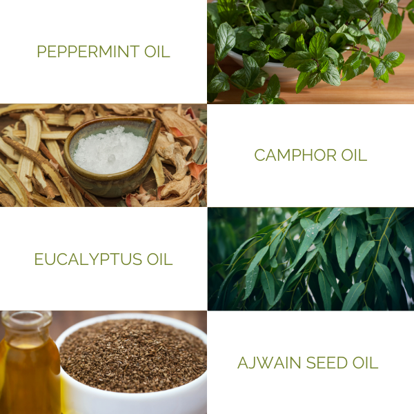 Cools the skin, helps reduce spasms, alleviate muscle ache and minimize swelling.