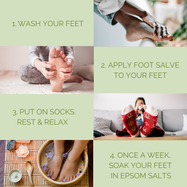 Add 1/2 cup Epsom salts to warm water in a foot bath. Soak feet for 10-20 minutes for pain relief, skin softening and total relaxation.